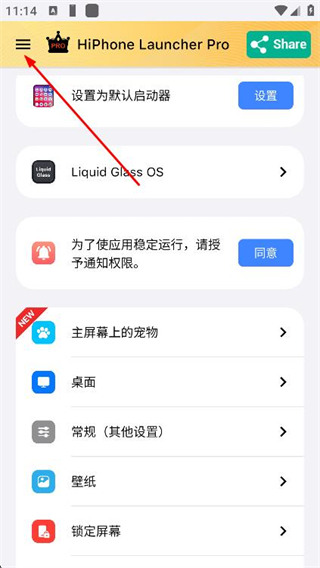 1、打开Phone14Launcher模拟器应用,点击界面左上角三条横线图标,展开侧边菜单。