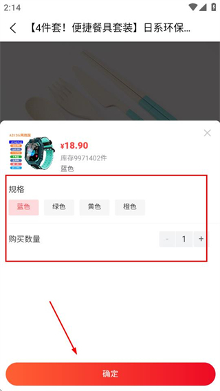 5、在购买窗口中,选择规格和数量后点击确定按钮,即可继续该商品的购买流程。