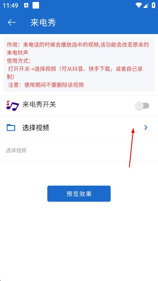 3、在来电秀页面点击选择视频,然后选择要设置的视频。
