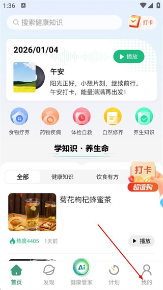 1、阅读用户协议和隐私政策后,点击同意,进入养生堂首页。