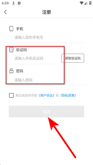 4、将收到的短信填入,在密码栏设置登录密码,勾选协议后,点击完成完成账号注册。
