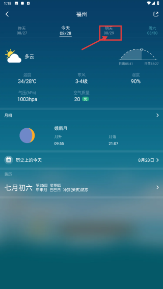 1、打开天气APP,在多日天气预报区,点击明天08/29 。