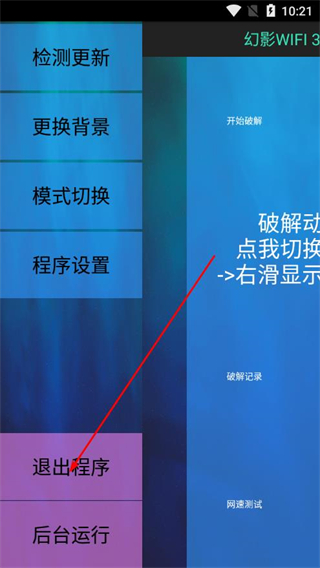 1、打开幻影WiFi APP,在主界面右滑显示侧边菜单调出菜单。