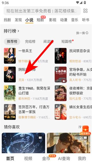 2、在小说频道页面,选择感兴趣的小说,进入小说阅读界面。