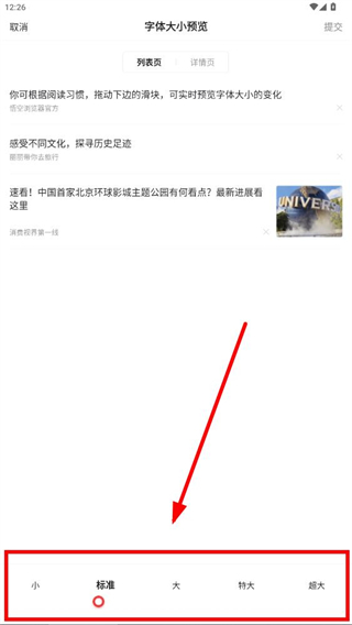 4、在字体大小预览页面,选择小、大等目标选项,即可完成字体大小的修改。