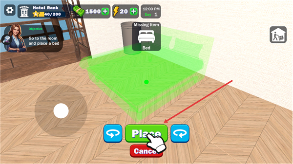 4、选中目标家具后,移动至房间内的指定摆放区域,点击Place按钮完成设施的摆放操作,完善房间的基础配置以推进经营进度。
