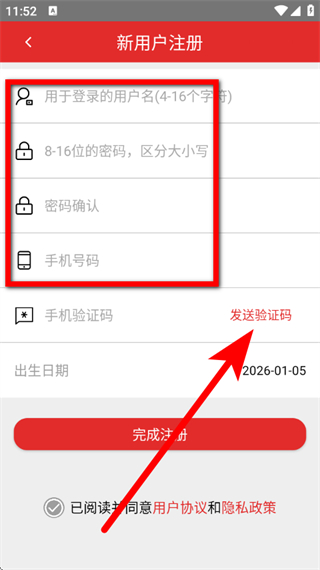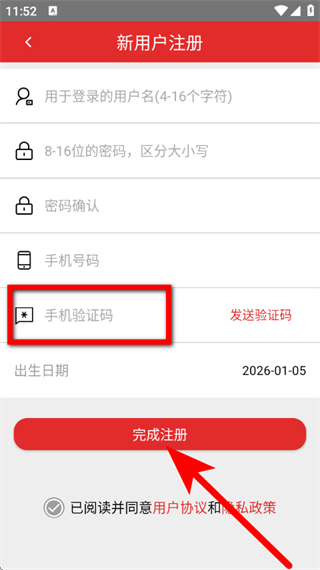 4、输入手机验证码,勾选相关协议后,点击完成注册,完成账号注册。