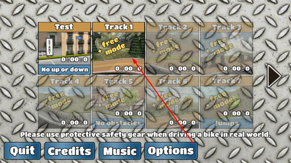 1、打开游戏界面后,是一个关卡选择,然后点击第一个开始游玩,玩家需要控制好画面中的赛车手,安全的在道路之上行驶。