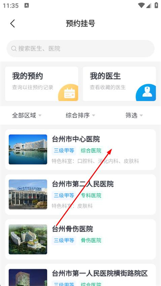2、在预约挂号页面选择要就诊的医院,进入选择科室页面。