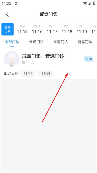 4、在门诊选择页面选择就诊日期和具体门诊类型,进入医生排班页面。