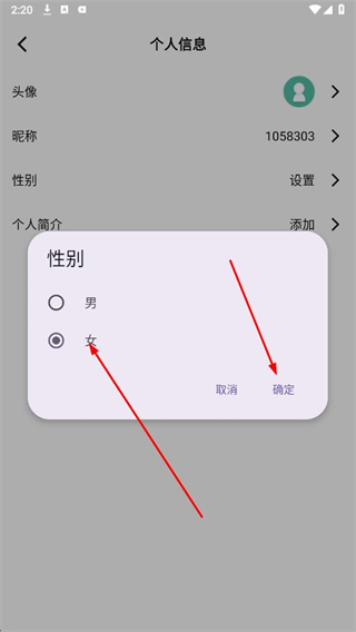 3、在个人信息页面点击性别选项,弹出性别选择窗口。
