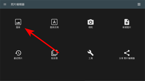 1、在照片编辑器主界面,点击图库,进入图片选择页面。