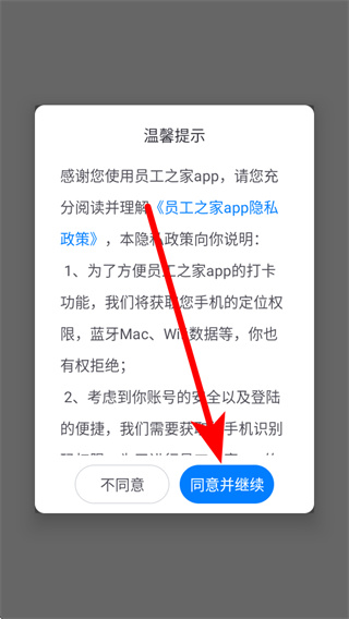 1、打开员工之家后,弹出弹窗,点击同意并继续,进入登录页面。