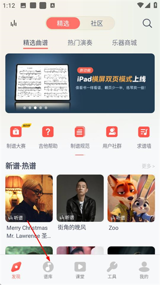 1、进入弹琴吧后,点击底部的谱库选项,可进入曲谱页面。