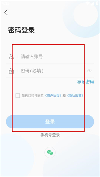 4、在密码登录页面,填写信息并勾选协议后,点击登录按钮即可完成账号登录。