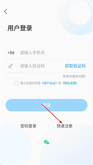 3、在用户登录页面,点击快速注册选项,可进入用户注册页面。
