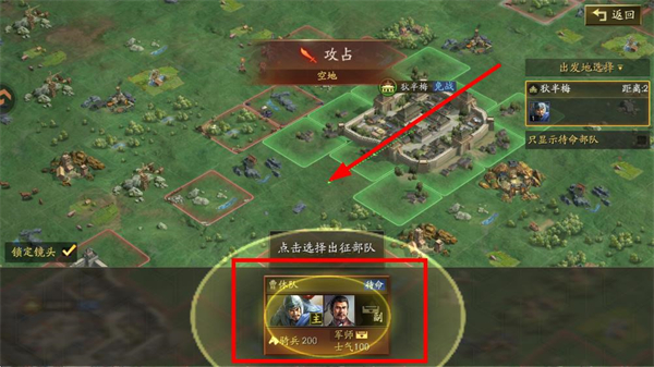 3、在地图界面,点击攻占的区域,选择待出征的部队,确认其处于待命状态后选定该部队。
