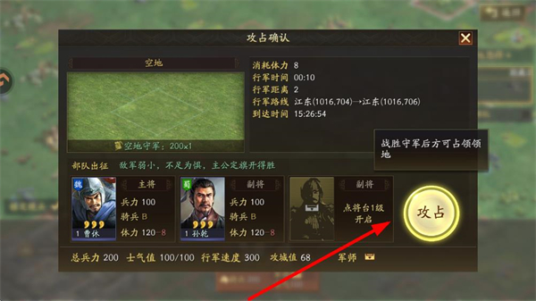 4、在攻占确认界面查看部队、行军等信息后,点击攻占按钮即可出征占领空地。
