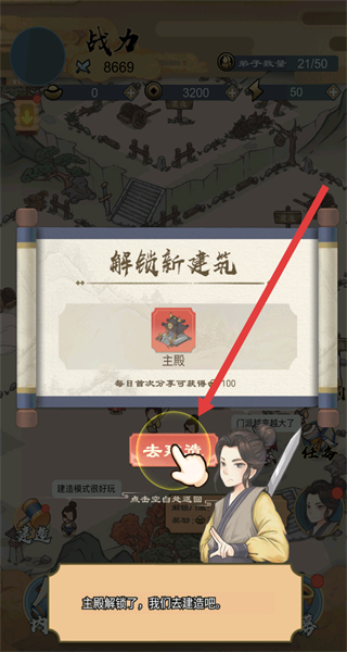 1、进入游戏后解锁主殿,点击去建造按钮,进行主殿的建造,拓展门派的核心建筑设施。