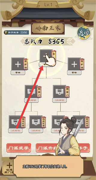2、主殿建造完成后,点击场景中的主殿建筑,进入主殿功能界面,开启门派职位管理相关操作。