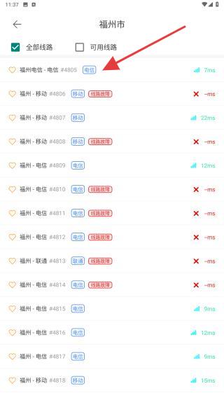 4、进入到福州市全部的线路内,点击福州电信的线路即可添加成功。