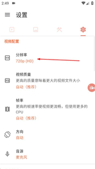 2、在设置页面查看视频配置选项,点击分辨率选项,打开分辨率选择弹窗。