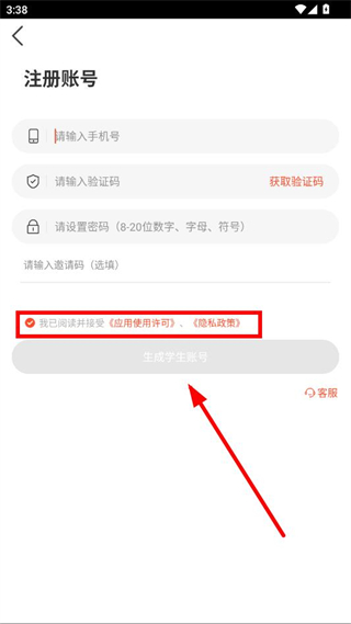 4、勾选我已阅读并接受应用使用许可、隐私政策后,点击生成学生账号完成注册。