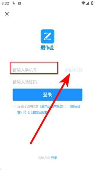 3、在登录界面的手机号输入手机号码,勾选协议后,点击获取验证码。