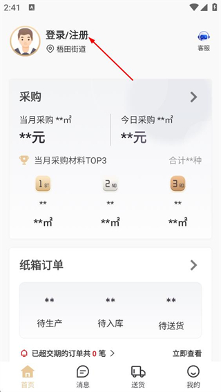 2、在主界面,点击顶部的登录/注册区域,进入登录页面。