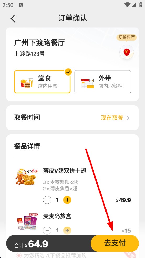3、在订单确认页面,点击去支付按钮,完成支付后即完成点餐。