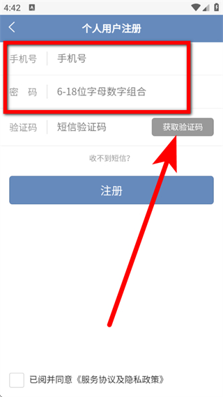4、在个人用户注册页面,输入手机号和设置密码,点击获取验证码。