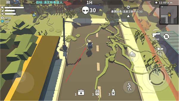 1、操控角色在街道移动,利用右侧武器如枪械瞄准敌人,攻击丧尸,推进消灭所有敌人的目标。