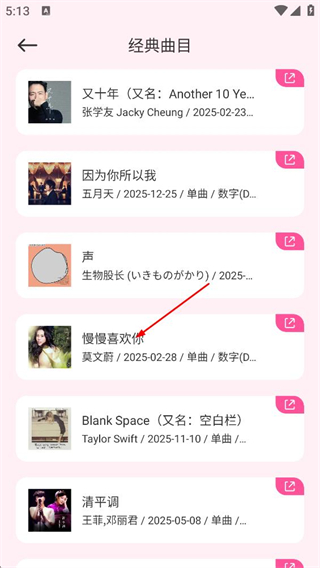 2、在经典曲目列表页面,点击慢慢喜欢你,进入该歌曲的详情页面。
