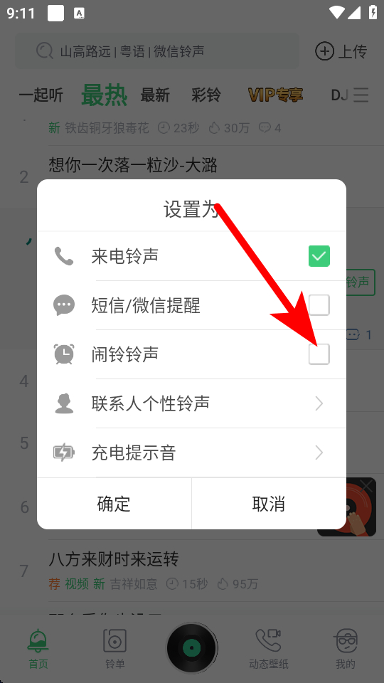 4、勾选闹铃铃声后,点击确定按钮,完成闹钟铃声设置。