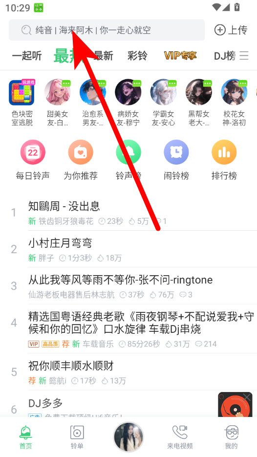 1、打开铃声多多APP,在首页浏览或搜索找到喜欢的铃声。