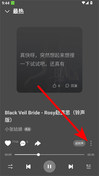 2、在铃声播放页面,点击右侧三点按钮,弹出功能菜单。