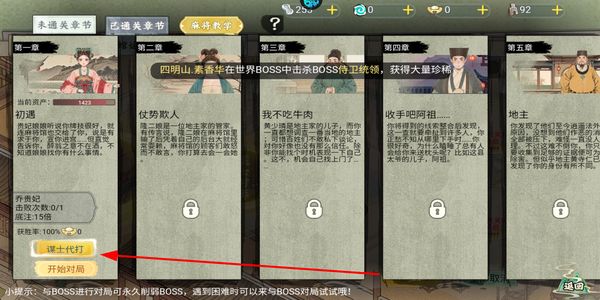 2、进入关卡章节界面,选择对应章节后点击谋士代打,可借助谋士来削弱对手,为后续对局降低难度。