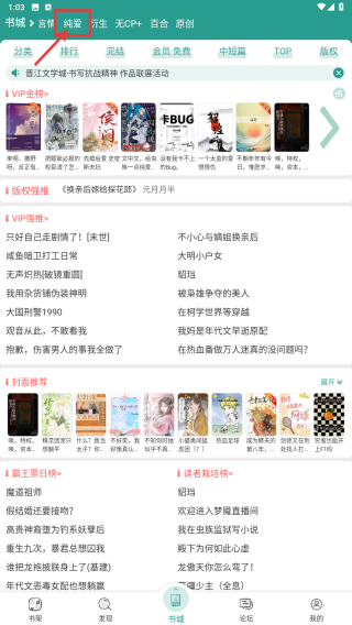 1、打开小说阅读类应用,点击顶部纯爱分类标签,进入纯爱类小说列表页。
