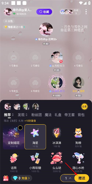3、在礼物选择界面选中心仪礼物后,点击赠送按钮完成礼物赠送操作。
