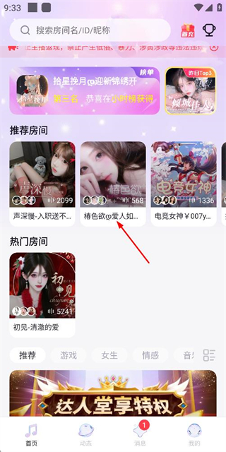 1、在首页推荐房间区域点击橘色恋人房间条目,进入该房间的互动页面。
