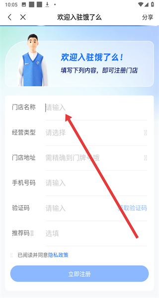 4、在门店信息填写页面依次输入对应注册信息后,勾选已阅读并同意隐私政策后,点击立即注册,完成门店注册流程。