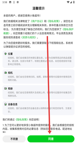 1、点击“温馨提示”的“同意”,进入小象超市主界面。