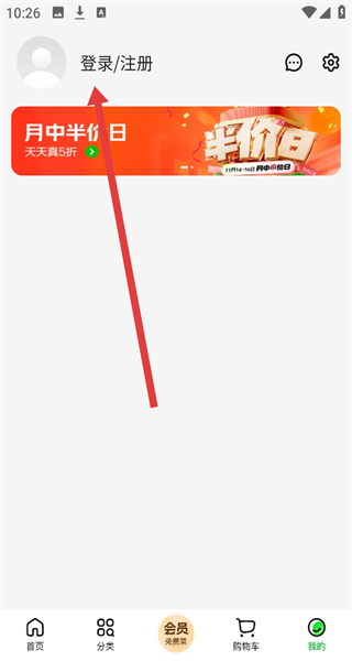 2、个人中心页面点击登录/注册,进入登录页面。