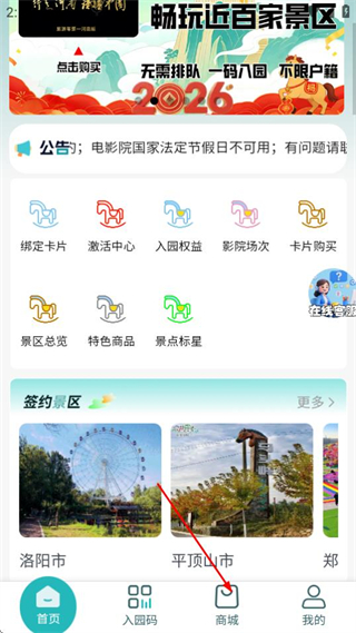 1、进入首页后,点击底部的商城选项,可进入旅游一码通商品列表页面。