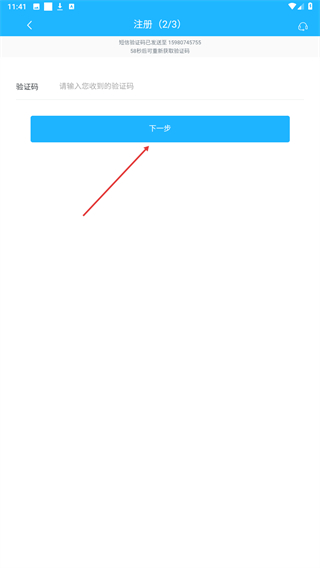 4、收到短信验证码后,将其输入到输入框中,完成填写后点击下一步按钮。