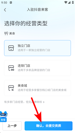 3、选择经营类型如独立门店、连锁门店等,点击确认,去提交资质。