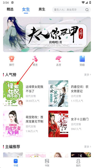 1、进入小说会后,点击女生分类,可进入女生频道的小说列表页面。