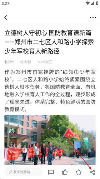 2、在新闻详情页面,点击分享按钮,可打开分享选项弹窗。