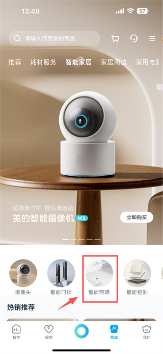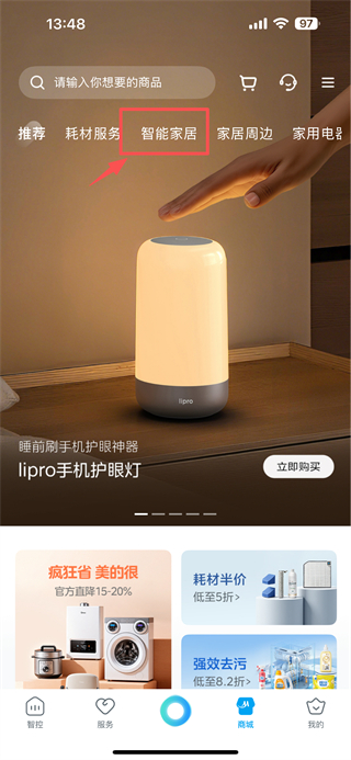 2、在商城页面,点击智能家居分类标签,进入智能家居商品专区。