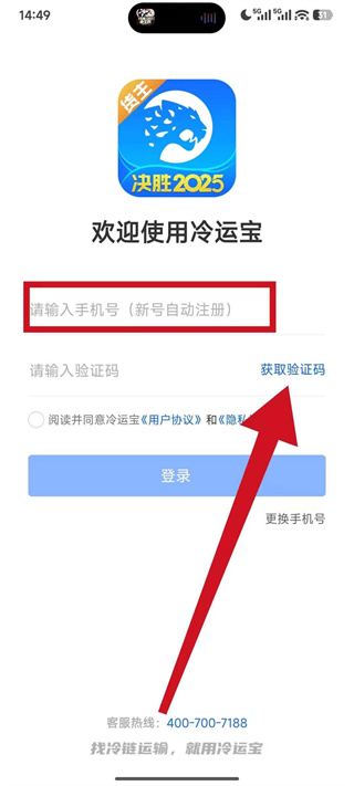 1、打开冷运宝,弹出协议弹窗后,点击同意,进入账号登录页面。